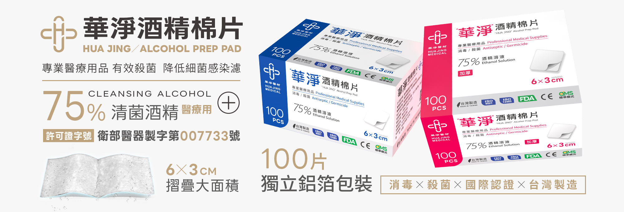 華淨酒精棉片內含75%酒精溶液,使用於注射、針灸、血糖檢驗…等醫療行為前之局部皮膚清潔與消毒;亦可使用於器械及儀表板擦拭,以降低細菌感染之機率,適用於皮膚表面及器械之清潔、消毒、抑菌作用;侵入性檢查前之皮膚消毒清潔。
